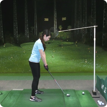 | スウィング軸が左に動く人は、スクールオリジナルの器具を使って矯正します。 | ![]() |